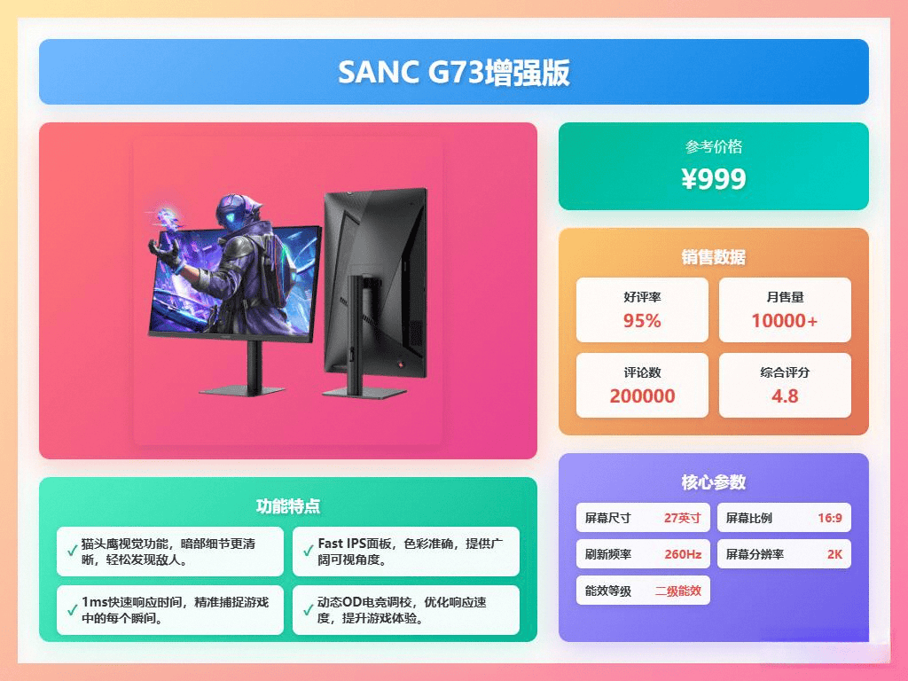 另外,别光看参数,还得考虑一些细节问题。比如,显示器的接口是否够用,有没有HDMI、DP这些常用接口,方便连接各种设备。还有就是人体工学设计,支架是否支持旋转、升降,长时间使用能不能让你保持一个舒适的姿势。有些显示器还自带低蓝光模式,能减少眼部疲劳,保护视力,像SANC G73增强版和酷开27K6都有这个功能,对于长时间对着屏幕的人来说还是挺实用的。最后,品牌售后服务也很重要,选择一个靠谱的品牌,售后也有保障。
