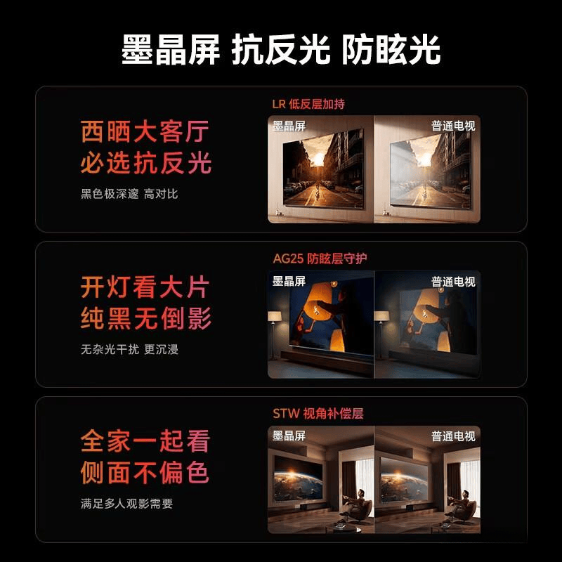 屏幕表面处理容易被忽略,其实抗反光和防眩光能力直接影响日常使用体验。特别是家中采光好或常开灯看电视的用户,柔光屏的优势很明显。别等到买回家才发现一开灯就看不清,后悔就晚了。结合使用场景来判断需求更重要。如果主要用来看赛事、看电影或玩游戏,那高刷新率和低延迟就是刚需。尺寸也要量空间而行,确保既能享受大屏震撼,又不会因距离太近造成压迫感。